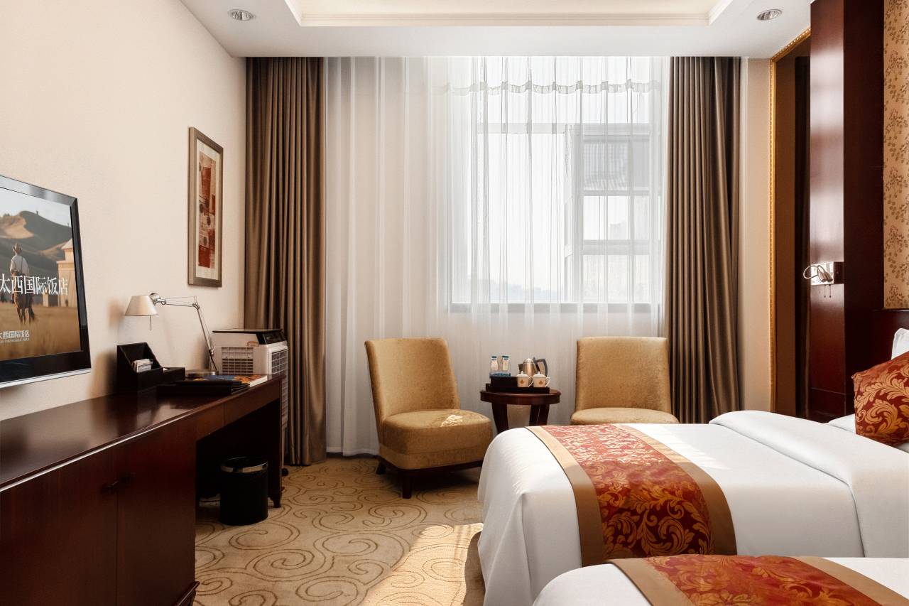 阿拉善左旗太西国际饭店是由内蒙古太西煤集团投资近4亿元,按照高星级标准打造的现代化综合性饭店。饭店主楼A座高6层,B座高7层,建筑面积近8万平方米,是集休闲度假、高端会议、美食文化、动感娱乐为一体的多功能饭店。饭店设施齐全,装修豪华典雅,融古典园林风格和现代设计风格为一体,独具特色。拥有各类客房,可供400余人入住、大中小型会议室共十几间可供1500余人开会、各类中餐厅30余间可容纳1000余人就餐,还设有宴会厅、西餐厅、康乐中心、桑拿按摩中心、室内游泳馆、商务中心、KTV包厢、棋牌室、洗衣房等优质服务和娱乐设施,配套项目齐全,可满足宾客多层次需求。这里有闲情雅致的环境、各式特色类服务,希望能成为您出行下榻的优选。