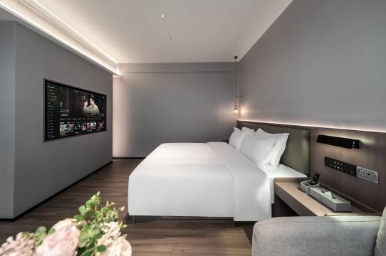 这次住的这家酒店体验感很好!装修简约高级有质感,空间宽敞采光好。全屋语音控制灯光、窗帘、空调,懒人福音。床品亲肤柔软,一夜安睡。卫浴干湿分离,房间干净无异味,细节贴心,前台服务热情周到,客房大姐也很客气。