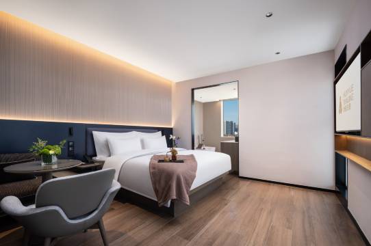 作为经常来这边参加展会、住半岛世界酒店的老顾客,这次入住体验依旧特别舒心来义乌参加展会快递比人先到,还没办入住就提前寄到了酒店本来还担心没人签收弄丢或者找不到,联系了酒店结果酒店工作人员特别负责 主动帮忙签收保管全程不用**心,办理入住高效等我办好入住就直接送到房间里,这份细心和靠谱真的让人特别放心出门在外最看重的就是这份安全感酒店整体是中式风格一进来就觉得很舒服,氛围雅致又温馨,没有那种浮夸的装修,待着特别放松。房间打扫得干干净净,整洁透亮,角角落落都很用心,设施设备也很齐全,日常用的东西一应俱全,完全不用自己额外准备对我们经常出差参展的人来说,酒店有健身房和自助洗衣房真的太方便了,忙完展会能锻炼放松一下,换下来的衣服也能及时洗烘省去不少麻烦出行便捷度直接拉满不管是前台、客房还是路过的工作人员,态度都特别热情亲切,见面都会主动问好,说话温和有礼貌,全程让人感觉被尊重、被照顾。不管是办事还是问路,回应都很及时,服务细节做得特别到位整体住下来特别舒心不管是服务、环境还是配套,都很符合我们参展出行的需求,性价比和体验感都没得说,主要这个酒店的地理位置是真的太得天独厚了去国际商贸城5分钟,去会展中心7分钟方便以后来这边参加展会,还是会首选半岛世界酒店,参加展会的第一首选酒店