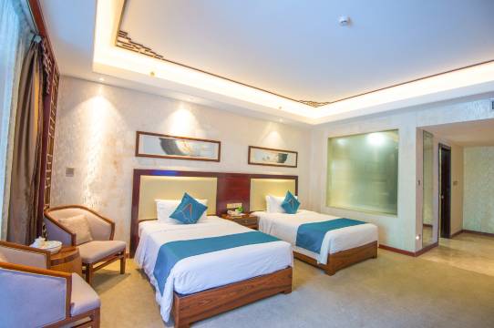 这是一家集住宿、餐饮、商务会议、康体于一体的高端商务会议宾馆,拥有各式客房,可供选择。客房明净规整,宽敞舒适,设施齐全,就算小朋友在房间玩耍也不会觉得空间狭小。