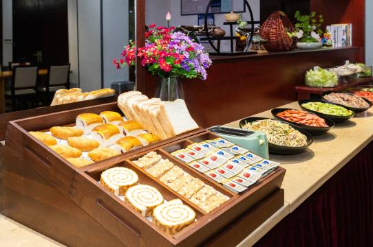 早餐种类丰富,包含地方特色美食如甜沫,酒店还提供文化体验活动,如漆扇制作、汉服试穿、书法和拓片体验,深受家庭和亲子客人喜爱。