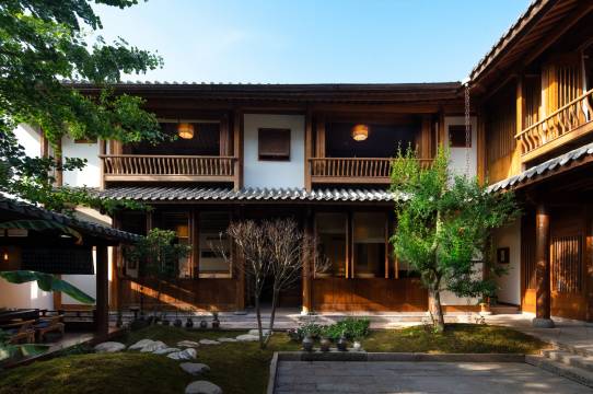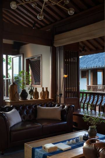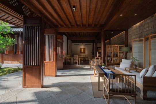 数十座老屋拆建时收集而来的夯土砖墙,全榫卯结构的两层木质小楼。从高高在上的一片青瓦,到黄昏时银杏树给青石板画上的灵动剪影,小院的举手投足间都是美好事物勾勒着浓淡相宜的时光。