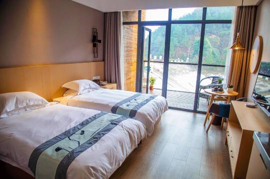 大床房在三楼,房间比较大非常安静业非常舒适。周围是个湖和临湖别墅,可以看到业主在湖里游泳。非常适合养心。周边配套没有,吃饭只能在酒店,好在味道还不错