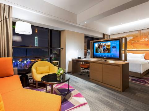 酒店设施齐全房间卫生条件好卫生间干湿分离,智能化照明,还有机器人送餐。虽然处在闹市区,但是晚上休息很安静,周边有地铁交通出行很方便,附近餐饮店也多。
