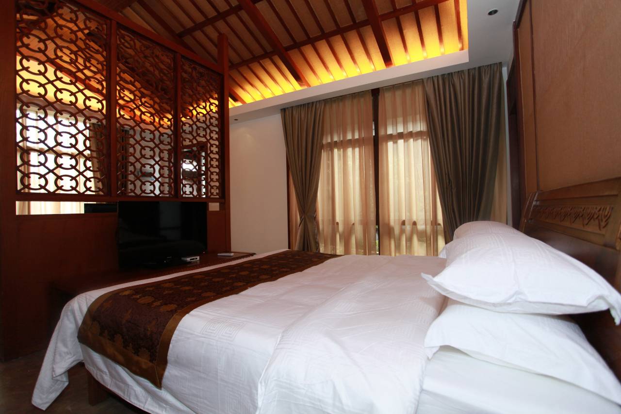 (三)山寨木屋别墅,采用清末民初的建筑风格,外观以石头和木质装饰为主,古色古香的木质建筑,充满复古野性的气息,带给你古朴独特的旅居享受。该房型专为VIP客人提供酒店式的套房和豪华单人间。
