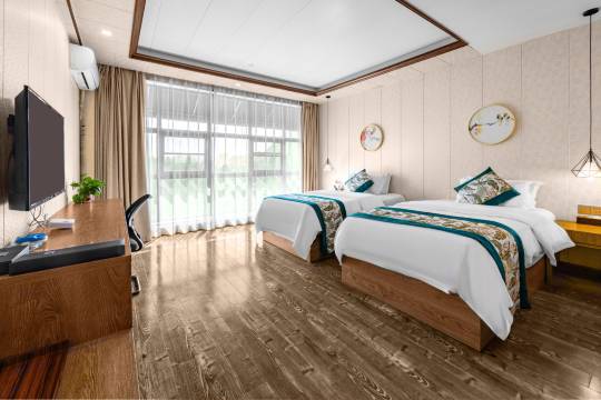 地上很干净,环境看上去就很舒适,房间也很大,非常喜欢,床也很软,房间很干净,挺满意的,挺有性价比的。