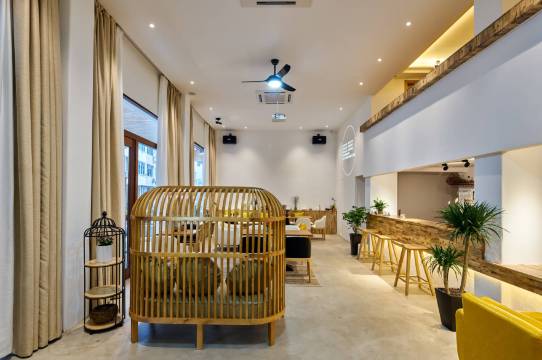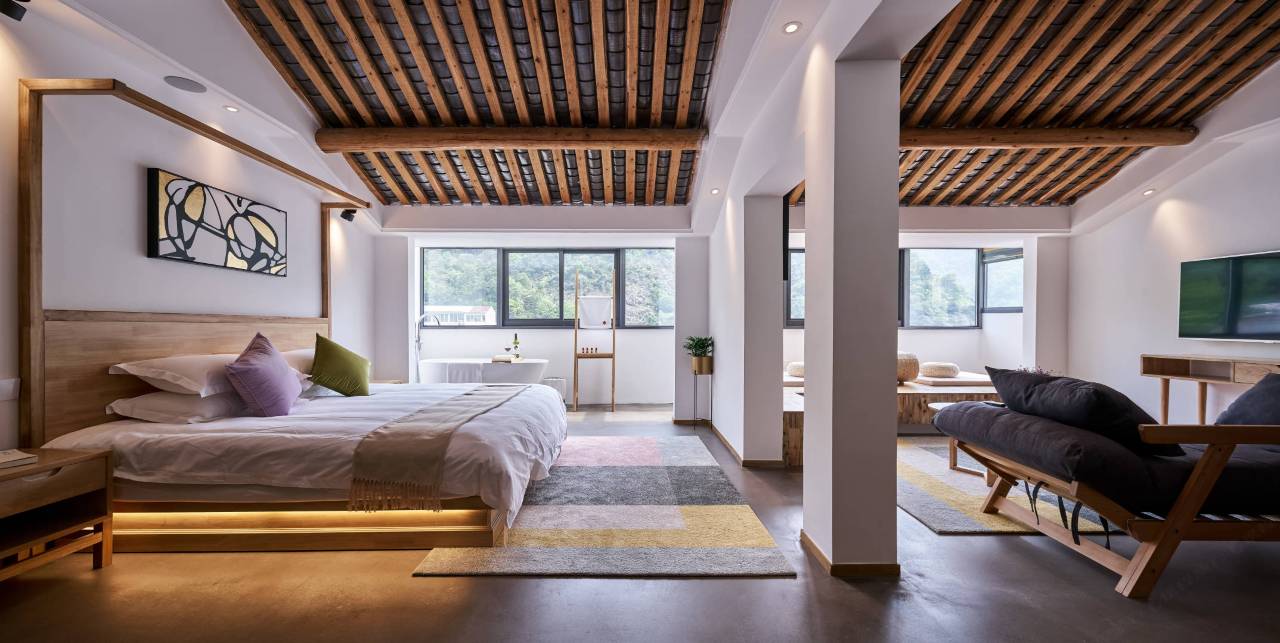 民宿拥有多种房型,采用了樟木贯穿楼梯与吧台,空气中带有淡淡的木材天然香;房间里的露天阳台、休闲飘窗、智能马桶、蓝牙音响、科勒洁具、乳胶床垫让客人们在青山黛瓦的风光里享受现代文明的新生活。更重要的是,房间之间的厚重墙壁与实木房门保障了客人的私密生活。同时公共功能公区也配套齐全,如独立厨房与餐厅、会议室(会议、唱吧)、休闲大厅(看书、观影、咖啡、品酒)、阁楼小憩、中式茶室、私密后花园、顶楼露天观景台、烧烤区等。