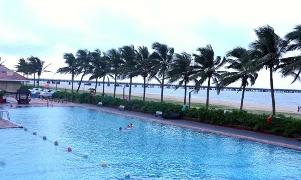 这个酒店,应该是整个海口的酒店里房间最靠海的了,酒店设施陈旧,如果对房间要求不高的话,入住体验还是不错的,主要有温泉和泳池,这里泳池拍照非常好看,温泉泳池是一体的,前面就是沙滩和大海,性价比很高。顺便说下,前台服务很热情,还有一个来我房间帮忙弄好电视的大叔人很好!
