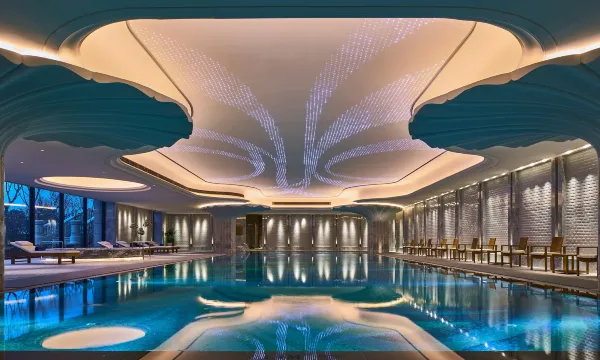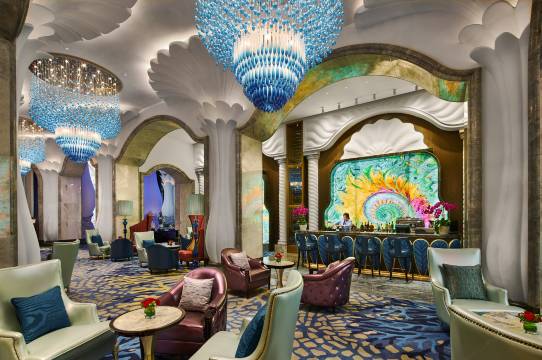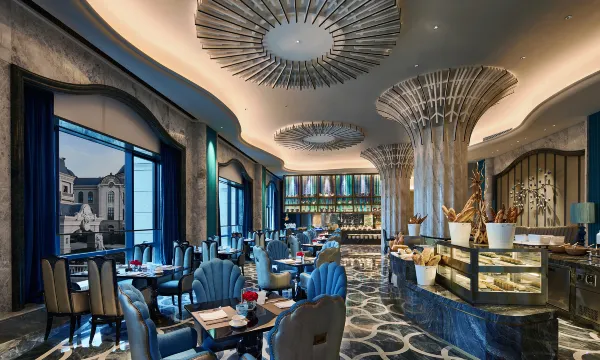 酒店整体设计采用古典欧式风格建筑结合欧洲航海文化及海洋元素。酒店大堂前的-鱼旋风雕塑喷泉,形成欢迎之势,蓝色渐变玻璃穹顶与造型独特的水晶吊灯及周围的手绘图案交相辉映营造了一幅海上美景,LED海螺墙面色彩变换,同时也增加了电影元素的艺术品,突出东方影都的主题。步入大堂,仿佛置身于美轮美奂的海洋世界中。酒店花园,林荫大树点缀着华丽的景亭,无边际水池和瑜伽亭营造舒适放松的环境,漫步其中,便可感受法式园林的奢华和浪漫。