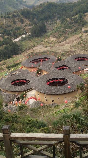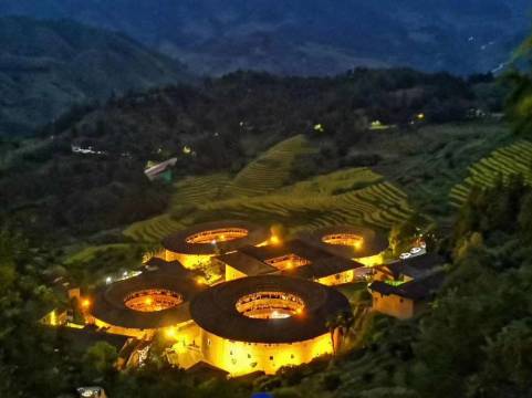 1 :位置极佳!就在田螺坑土楼群附近,走路3分钟可到达观景台,欣赏四菜一汤美丽夜景!白天往下走370左右台阶,约10分钟,即可慢慢参观四菜一汤土楼!