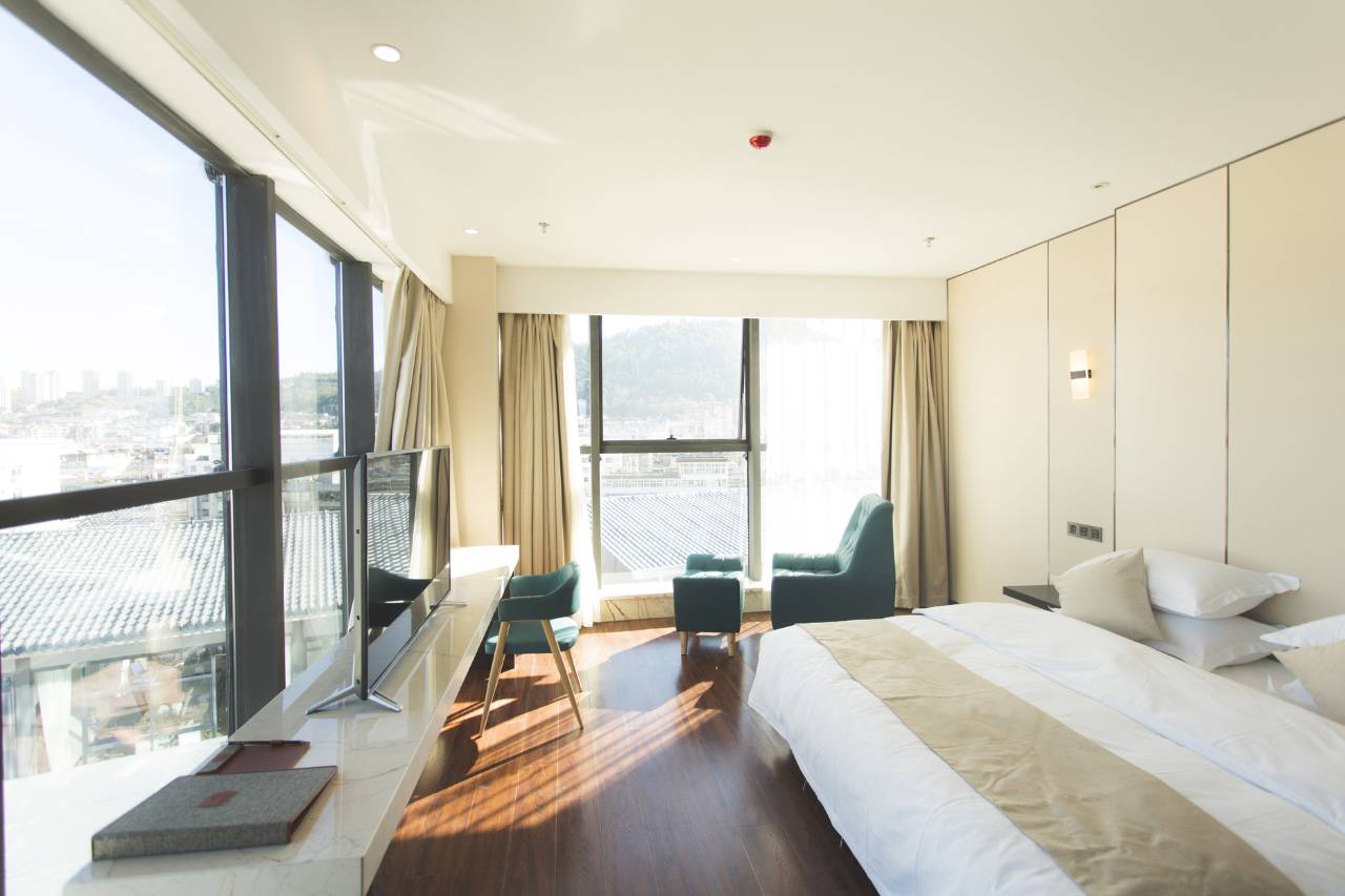 地理位置优越,窗户大,看得远,视野开阔。在房间里面就能看到美丽的秀山,风景极好,视野非常开阔,心情也不错