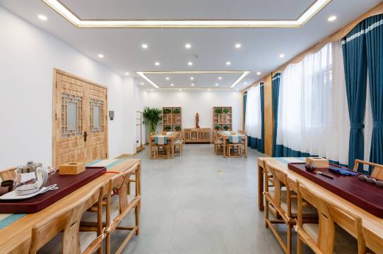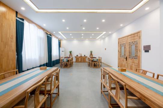 走廊悬挂风格迥异的山水水墨画,非常有文学气息。
