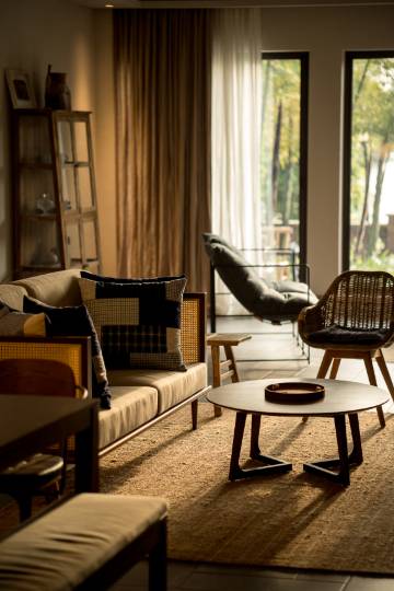 竹风别墅相对独立,前门是小巧的院子,后门是一丛茂密的竹林。一楼宽敞大气,适合一家人坐在一起看电视、聊天或各自看书刷手机,二楼两间卧室一间卫浴,小卧室外面有阳台。房子的布置古朴典雅,相当符合中式审美。这次被我挖掘到一本好书,可惜太厚了没看完。
