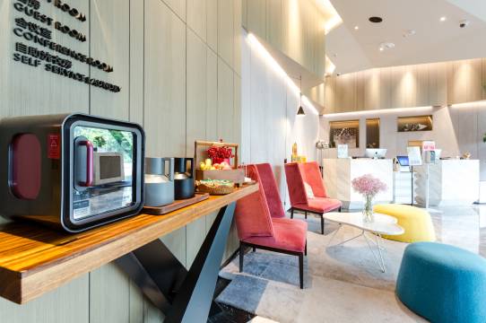 这家酒店是我二月份就预订的,幸亏预订早,现在已经涨了一些。走进酒店大堂就看见有一个机器人站在门口,感觉挺先进的。这里的工作人员都非常热情周到,办理入住手续后,有一名工作人员送我们到房间里,由于现在都没有随身带现金,所以也没有给小费,有一些遗憾。进入房间后,自动窗帘会自动打开,房间里很明亮,通风采光好。工作人员介绍了怎么连接网络和使用酒店设备的相关事宜。马桶是智能的,不过不会感应自动开盖和自动冲厕,但是已经蛮好了,有清洗和坐垫加温的功能,而且卫生间也很明亮,卫生间的帘子显示是电动的,不过按下没有反应,我们自己动动手拉起来也没问题。房间没有异味,还有一台空气净化器。另外还有一台小冰箱,里面有赠送的两罐饮料,并说明了这是免费的。还送了欢迎水果,一个梨子和一根香蕉,都很新鲜。我们住了两天。每天都有送两大瓶矿泉水,非常适合游玩回来的客人解渴。洗浴用品每天都有安排,打扫房间也很认真,很干净,我们玩了一天回到房间很舒心。这里环境很好,很安静,一点都不吵闹,早上酒店还安排有自助餐,虽然不是免费的,但餐品丰富,咖啡特别好喝,小馄饨很鲜美,也很值了。附近就有著名的旅游景点“彩衣街”、“东关街”、“个园”,从酒店走过去感觉七八分钟就到了。我们很喜欢“忘不了”老鹅和“蟹上皇”的蟹黄拌面,真的超赞。我们最后一天退房的时候,还收到了酒店赠送的扬州特产,非常开心!酒店还有一项特色服务,就是能延迟退房,我用积分兑换了这个服务,对于下午才去乘火车的人而言真的太棒了!如果以后再来扬州,还会选择入住这家酒店!
