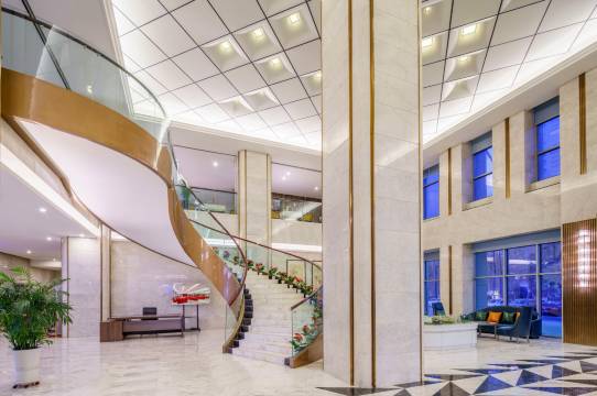 酒店服务超好,大厅遇到不同时间值班的几个小姐姐说话都超有礼貌,而且很贴心,前台还有客房服务人员也超级热情。外卖送来酒店自己的工作人员会帮送上去,这也是让人感到非常安心的点。需要接机工作人员也会仔细询问航班信息,大厅环境很棒,主打一个安静舒适,适合商务出行,酒店大厅还有旋转楼梯,很有设计感。交通便利,停车也很方便,进电梯刷房卡很有安全感,房间布局合理,干净整洁,床品也很舒服,早餐种类繁多,很棒的一家酒店,推荐!!