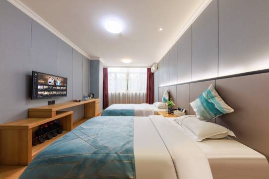 广交会期间附近很多酒店都涨价了,这里反而好像比之前还便宜了,而且这里就在家附近,在阳台就能看见,这是开了好多年的酒店。订了间大床房,网上说的是1.8大床,但一进房间就惊叹~好大的床啊!目测不止1.8米,后来验证了自己的眼光,那是两张单人床拼在一起的,两张1.2米拼成2.4米的大床,厉害死了,整个房间有20多平米,性价比太高了。