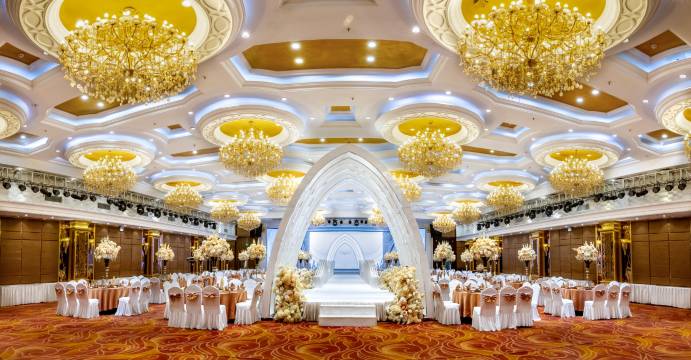 天兴国际酒店拥有总面积达5000平方米左右的宴会会议场地,25个设计独特的贵宾包房,10余间不同面积典雅的多功能厅,会议厅,均配有先进的视听设备,无线网络服务,大型LED屏幕以及由专业技术团队提供的全方位支持。1000平米的无柱式宴会厅拥有高达5.4米的天花板和流光溢彩的豪华水晶吊灯,可举办600-800位宾客的庆典活动,空间宽敞的迎宾区,欧式风格的婚礼礼堂,给您带来全新的婚礼体验,灵活多样的设置布局可满足您的各种会议和活动需求,专业经理人全程为您量身定制专属的宴会会议流程和服务!