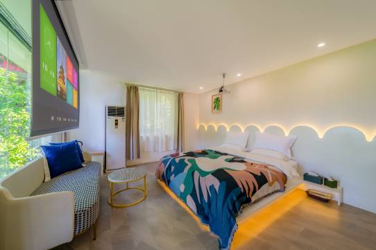 店家小姐姐人超好超温柔!我们到店的时候在装修怕吵到我们,小姐姐为了补偿我们给我们免费升级了房间。房间很大很宽敞,不得不提的是床超软超舒服!投影也很好用~性价比超高!楼下还可以喝咖啡撸猫,太棒啦!