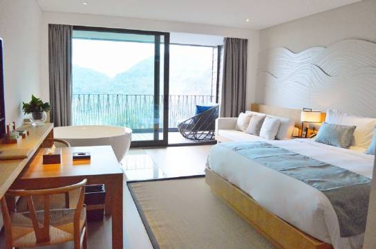 三天二晚的度假非常惬意。感谢前台升级了房间。酒店环境优美,房间的用品和布置很舒适。非周末时段很安静,接驳车随叫随到,管家回答问题不厌其烦。自然餐厅和䄻尖中餐厅都不错,服务和味道都满意,早餐可以到10点半,也感觉很宽松。喜欢早餐的环境和窗外的大草坪。另外表扬一下草坪的工作人员,我们退房后在草坪边小憩一下,原来在旁边割草的他,就自动移动到远处去工作了,把安静优美的环境留给了我们。还有入住和退房时都送了酒店桃园里新鲜的桃子。感谢!
