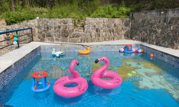 山里很凉快,即使城区40度的天气,山里的温度也很适宜,非常适合避暑。民宿离天目源漂流很近,民宿有车直接送到上码头,终点步行一两百米就能直接回到民宿,非常方便。民宿可以定餐食,一天三餐都能在民宿搞定,即使不出去玩,民宿里泳池玩水,荡秋千,喂小兔子,甚至落日后的帐下聊天都很舒服。