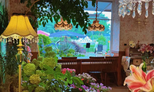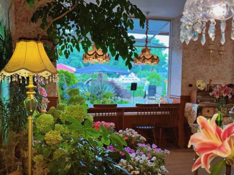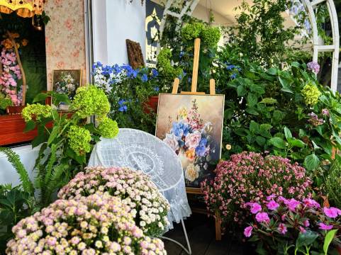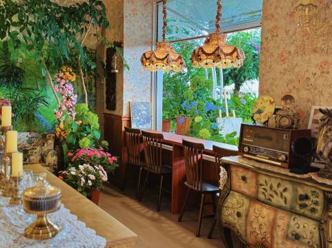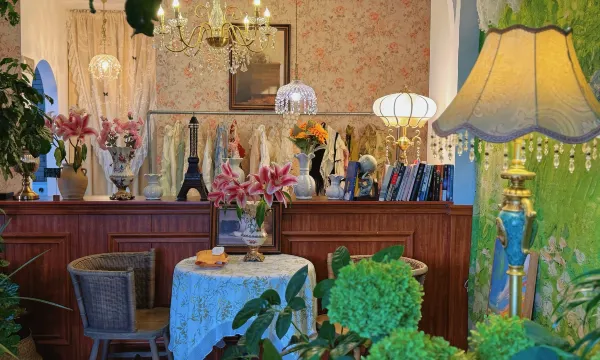 旁边的咖啡店品质不错,住客有折扣。值得一提的是,在店里买咖啡后可以穿服装,有设计感的长裙和外套可选。这个服务挺方便,租了条裙子在院子里拍照,效果很自然。
