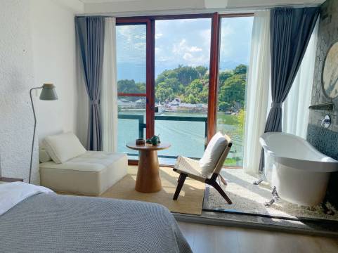 我们住的房间视野开阔,落地窗正对着水。每天醒来就能看到自然的绿意,很安静。房间布置简约干净,浴缸对着窗外,泡澡时看看风景很放松。
