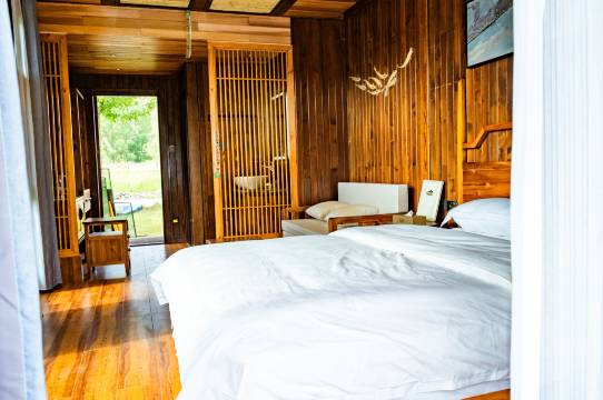庄园酒店环境非常美妙,大大的草坪复古的房型,住起来是一种很好的体验!定个四人间是上下铺,木头床非常的结实,上铺空间也很大!满足一家人的出行!