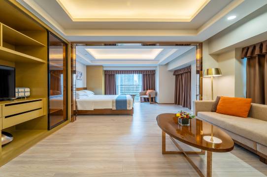 房间干净整洁,空气很好,景色不错。房间里面有洗衣机、有冰箱,果断续住了一天。去拱北也很近,附近也有吃的,去华发商都也很近,挺好的酒店停车场非常大,免费停车,有充电桩,真的非常不错