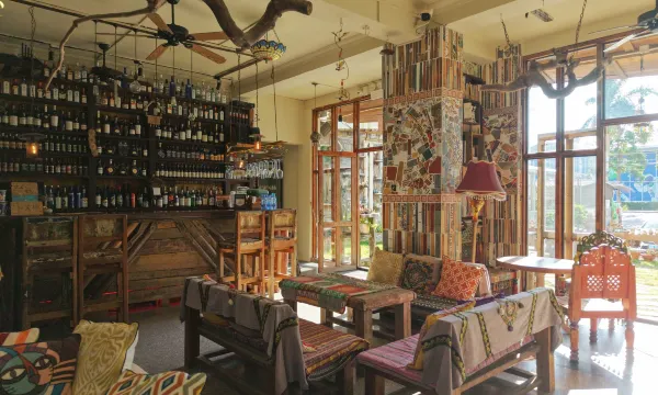 装修很有格调,波西米亚民族风,楼下小酒馆很有氛围,老板审美在线,人也好,免费给我升了房,房间风景不错,建议蓝色窗帘换一换,和整体风格不太搭,两片式也会留缝隙,卫生和细节有待提高