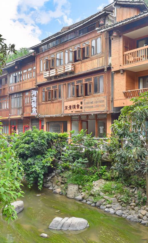 肇兴侗寨四面环山,两条源自山间的小河蜿蜒曲折,穿寨而过,肇兴临水阁客栈就位于小河旁,是一座古香古色的吊脚楼,装修设计以木质为主,讲究古朴、传统,具有民族特色。