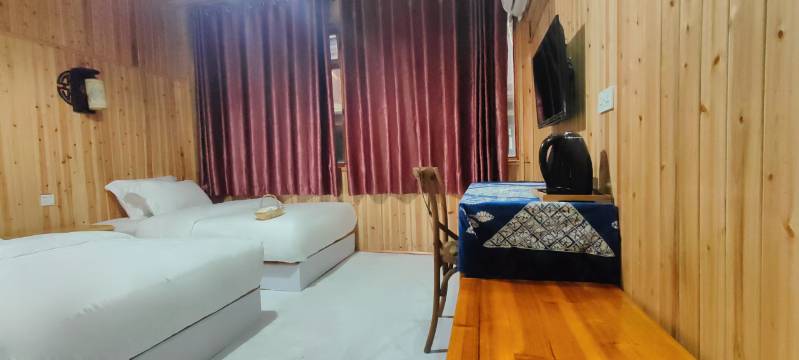 房间很赞,被子干净,除了水龙头需要冷热两边调节才能出温热水,其他设施设备都比较完善和卫生,晚上白天的河景也好看,沿河靠山的位置,很安逸就是了,下次试试春夏季的时候来,老板基本都能车接送站 比较便利