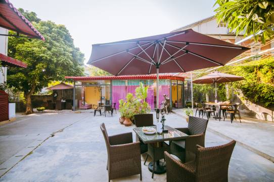 鼓浪屿娜海花园旅馆有一个600多平方的艺术花园,清幽的自然环境,午后可以在庭院晒晒太阳,院子里龙眼树枝繁叶茂,一把伞,藤式桌椅,一杯下午茶,很是惬意。