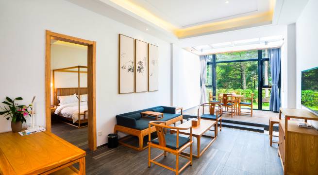 第二次入住了,非周末入住,非常清静,吃饭门口就有饭店,周围环境没话说,特别落地窗,屋内看着远山,特别放松。