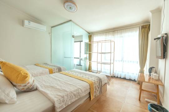 老板态度很好,帮忙拿行李到房间,很热情,主动说推荐景点和好吃的地方。房间不是很大但干净。距离金鳞沙滩入口很近,步行可以到邛海栈道。到沙滩需要座2站公交车。还是方便。