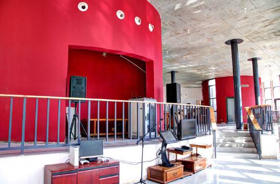 大堂为参天白杨所环绕,内设餐厅、pub区域、KTV,会议厅、茶座若干及前台,另有一地下通道直接通往河边观景区域;楼顶设置了若干露天茶位,有栈道与坡地的木屋相连。厨房、员工宿舍在大堂的后侧。院内设有停车场,若干个吊床、秋千、茶座及喷泉、瀑布等景观供游客赏玩。大堂外设有一户外临河餐厅。