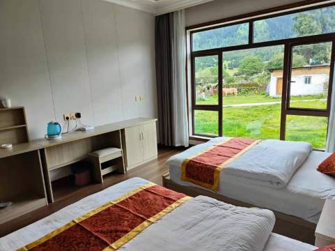 老板娘很热情,住宿环境很好,也很方便,住的房间一拉开窗帘就能看到外面森林和草甸,老板家也可以吃石锅鸡和藏餐,首推石锅鸡,味道很鲜美,