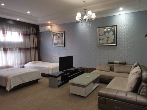 豪华套房里边有两个独立住宿的房间,一个大床一个标间,中间隔着一个大的客厅,挺好的,干净卫生,也比较安静。停车方便。