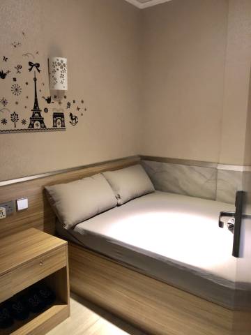 房间没有想象中那么窄,以为一张一米一的床会很小,但是没有,两个人睡得挺舒服的,很干净,以为床和厕所离得很近会有异味但是没有!!超乎预期的舒服,不错不错。