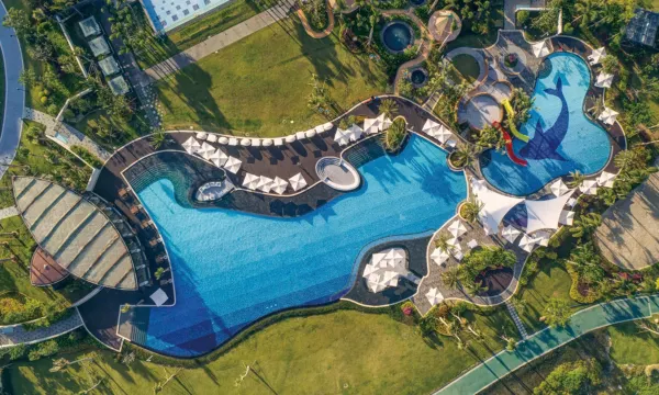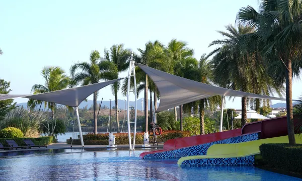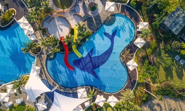 阶梯式泳池群设计巧妙,浅水区适合幼儿玩耍,成人区则有无边景观。酒店每天提供免费接驳车前往石梅湾沙滩,并提供挖沙工具和冰饮,这项服务很贴心。