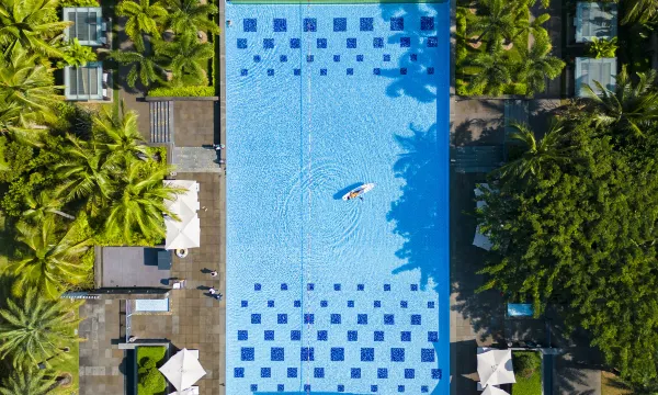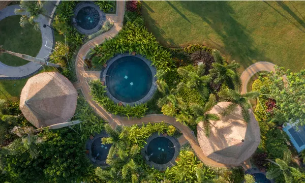 傍晚在椰林下的温泉池放松,能闻到空气中飘散的淡淡植物清香。
