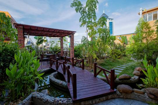 酒店服务很棒的,网上订单房,特意联系酒店要留环境比较安静的房间,入住当天给安排了不靠马路的房间6楼,窗外还能看到景色,早上是被小鸟的叫声叫醒起床的,哈哈……走到窗外一看,哟,5楼竟然有个小园林,这家酒店不错哟!
