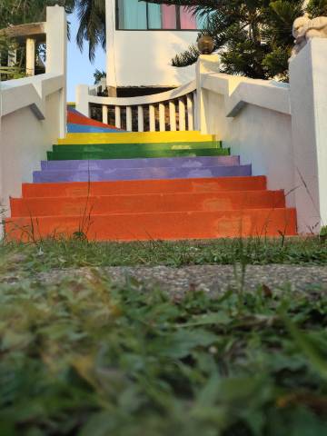 院子里有香蕉树,近距离观摩,从五彩楼梯下去很快可以到下边及沙滩,附近有711,水果店,药店,及路边摊