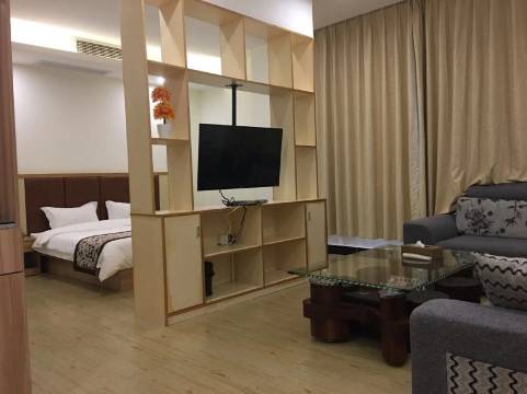 住得很满意。在网上订的时候还感觉有点担心,看照片似乎有点“土”,实际上不会。住的亲子房,两室一厅,浴室很大,有浴缸,客厅有大沙发。每个卧室虽然都不算太大,但有中央空调,床铺舒服,拉开窗帘就是绿树,墙上挂着书法作品。拉开窗帘有树影落在床上,给人一种安宁幽静雅致的感觉。