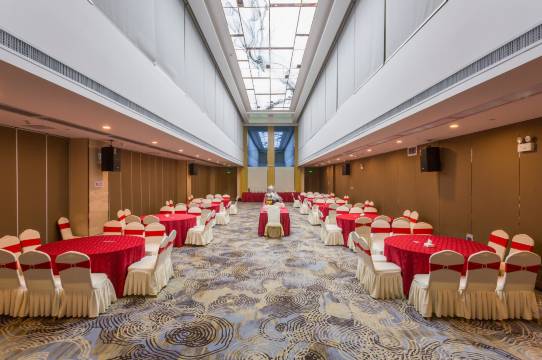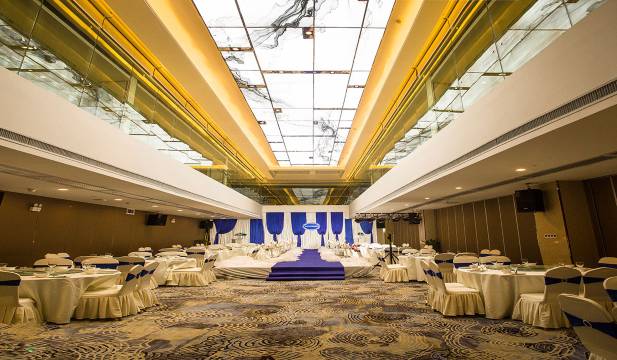 豪华宴会大厅,可容纳500人同时就餐,适合举办各类商务宴会、婚庆典礼等大中型宴会活动;自助餐厅位于酒店12楼,浓缩各地方菜肴精华,满足你和你家人的味觉享受。