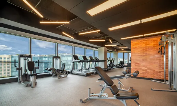酒店10层健身房,两面都是落地窗,视野开阔。健身时心情愉悦