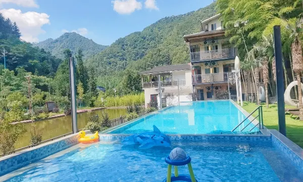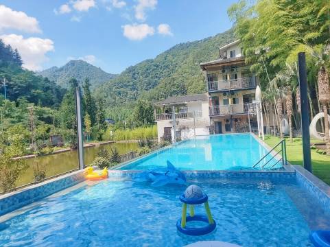 位置很方便,进景区门后过隧道就到了。b馆就是别院,停车可以停别院这边。里面有游泳池和蹦床可以玩,外面也有一条很浅的小河沟可以耍水。