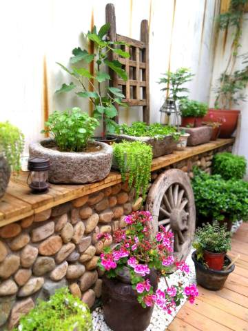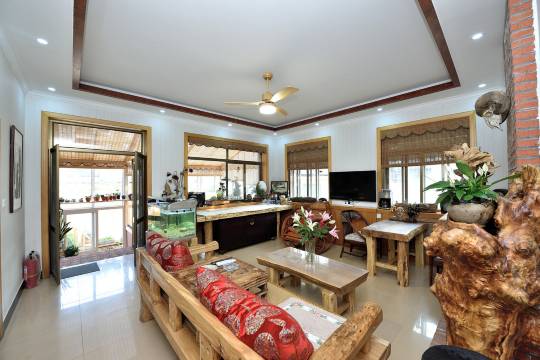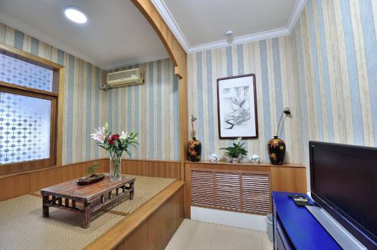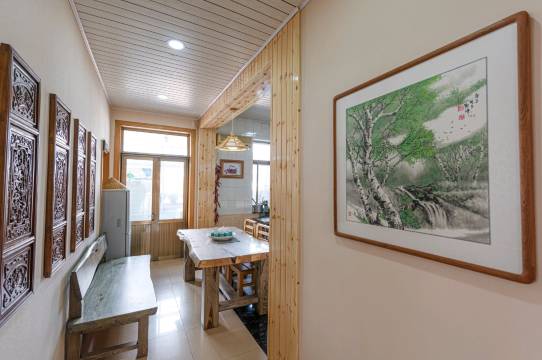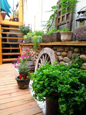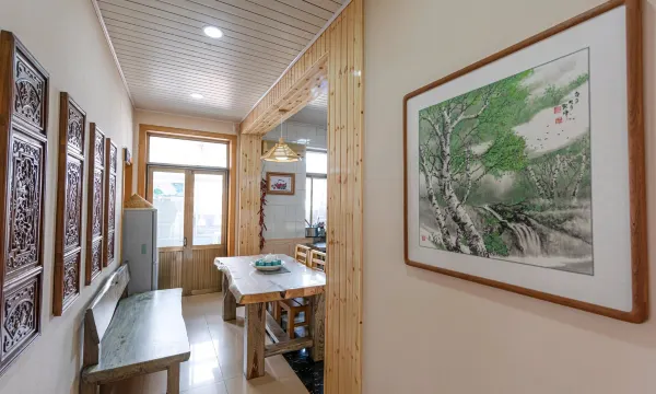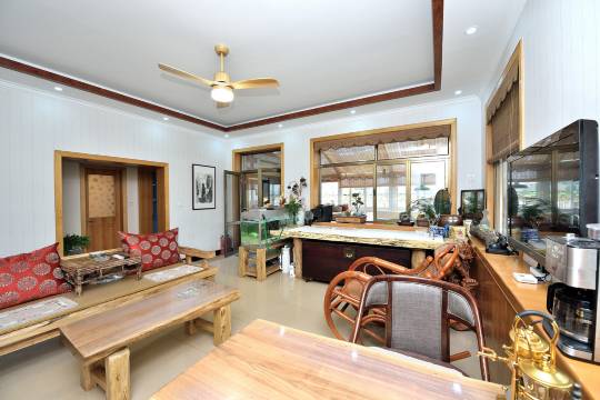 在北戴河这个遍布琳琅满目豪华客房的小城里,请来我的《寒舍》,让你感受别样的味道。推开一扇布满铁钉的岁月老门,映入眼帘的便是我的《寒舍》。小小的院落一眼便会让你欣喜。右手边铺满鹅卵石小花墙上是一排很有味道的小石槽,里面缤纷的花朵向阳开放。左手边有一个很老气的大石槽,潺潺的流水经过一个老坛罐流入一台老石磨,再流入长满睡莲,锦鲤穿梭的老石槽中,一层层水气荡漾在充满岁月的器皿里,让睡莲安静,让锦鲤悠闲。正对着大门有一座别致的小木楼梯带你走上露天阳台,这里有连排的木椅,有大大的板台,可以用餐、可以品茶、可以棋牌,头顶墨绿色的大伞为你遮阳挡雨,适时而开。小小的院落带给您小小的欣喜,希望房间不会让您失望,推开房门首先进入的是温暖的阳光房,随着木台阶拾级而上,两侧和头顶摆满了各色的漂亮花盆,里面当然是各色喜人的肉肉,这些小东西那么可爱又养眼。阳光房里极具特色的大茶台是新与旧、静与动。