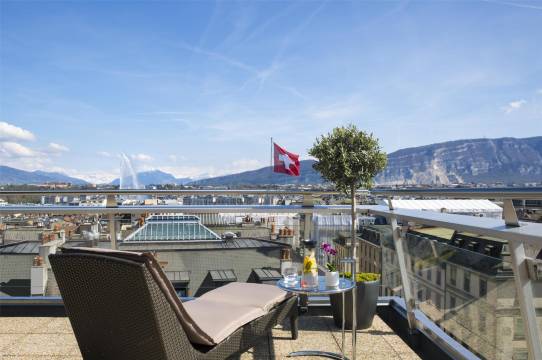 酒店紧邻日内瓦车站,交通极其便利,距离日内瓦湖边也是步行可达,所选的房间位于楼顶,西晒严重,还好隔热很给力,晚上九点半后在露台上看看街景非常惬意
