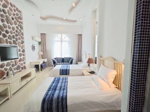 去山海关旅游顺便去了东戴河,携程上搜索酒店被这家酒店的外表图片吸引,入住发现真的和平台描述一致,圣托里尼地中海度假风格,房间宽敞明亮蓝白色搭配,有海洋元素,设施齐全,洗澡水够大,毛巾浴巾都是一次性的,卫生,空调给力无噪音,背景灯光柔和温馨,住着很舒服,酒店门口一整排餐馆 ,也有超市,生活便利,白天热闹晚上不吵,安静睡到自然醒,服务员热情 有问必答有求必应,如有机会再来一定再次选择!