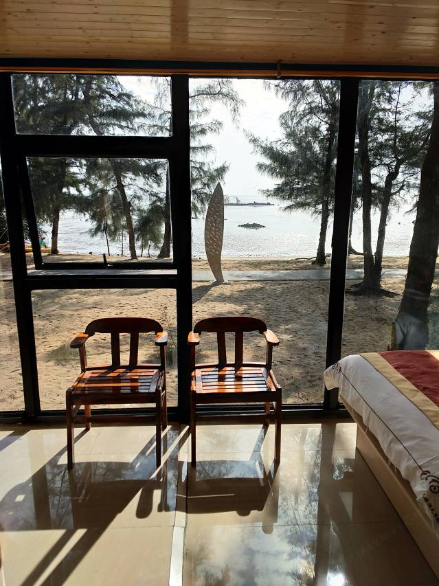 房间外边看着卖相不咋地,像活动板房,房间里边还行五脏俱全。最重要的是,出门便是海边,马上玩沙马上下海,很棒。